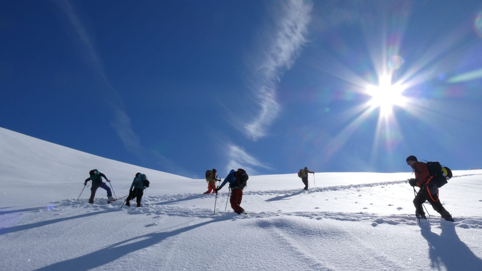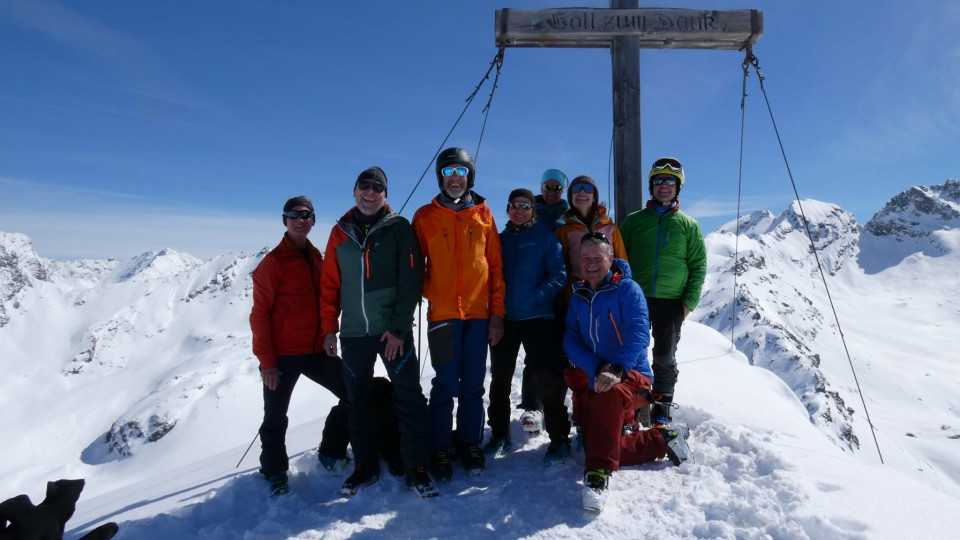 Nach einer genussvollen Gipfelrast folgte die Krönung des Tages: die Abfahrt. Über das Hochkar unterhalb der Hennespitze eröffneten sich traumhafte Hänge, die teilweise noch unberührt waren. In lockerem Pulverschnee zog die Gruppe ihre Schwünge talwärts – ein Erlebnis, das allen Teilnehmern ein breites Grinsen ins Gesicht zauberte.