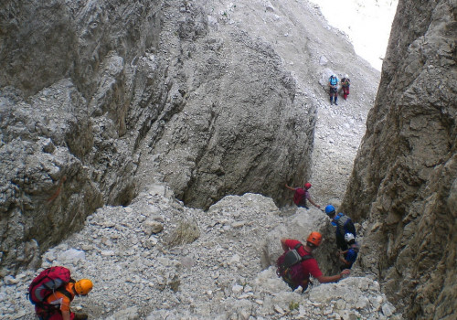 Wir folgten einer Steinschlaggefährdeten Schlucht auf den ersten Vorbau. Die Markierungen war zwar schon ausgebleicht aber trotzdem gut sichtbar. Von dort ging es auf und ab weiter mit leichten Klettereien und über schottrige Bänder. Dann die erste längere Kletterei im II. Grad mit einer Querung, absolvierten wir auch ohne Sicherung. Bald waren wir beim ersten ernsthaften Kamin, hier packten wir das Seil aus und sicherten die 15 Meter auf das obere Ring Band. Hier war der weitere Wegverlauf unklar, links oder rechts? Anni und Martin waren außer Sichtweite. 20 Meter nach rechts und da sah ich ein mit alten Fixseilen versicherte Verschneidung mit einen Riss. Da ich von den alten Seilen gelesen hatte musste es hier weitergehen. Der Einstieg vom Band war doch etwas schwerer als III, aber dann ging es recht flott zum ersten Stand. Ich holte Judith und Christa nach. Patrik folgte dann auch schon mit der nächsten Seilschaft. Nun wurde es schwer. Direkt die Verschneidung ohne Zwischensicherung war mir nicht geheuer, deshalb umging ich das Ganze. Es waren dann auch 20 Meter im IV. Grad bis ich den nächsten Stand erreichte. Das Gelände danach schaute nicht schwer aus, also musst es passen. Aber der Plan den Rest der Mannschaft nachzuholen scheiterte. Die direkte Verschneidung war zu schwer, da half auch kein Expressflaschenzug. Also wieder abseilen, in 2 Etappen bis zum Ring Band. Nach kurzer Lagebesprechung erreichten wir Martin am Handy und wir hatten die Gewissheit das wir falsch waren. Nach LINKS und nicht nach rechts am Ausstieg des Risses!!! Uns fiel es wie Schuppen von den Augen als wir 5 Meter neben den Riss die Markierung sahen! (SchoWe, Du brauchst eine neu Brille! Auch das Anni mit Martin in der kurzen Zeit nicht hätten die 2 Seillängen klettern können hätte ich wissen müssen…)