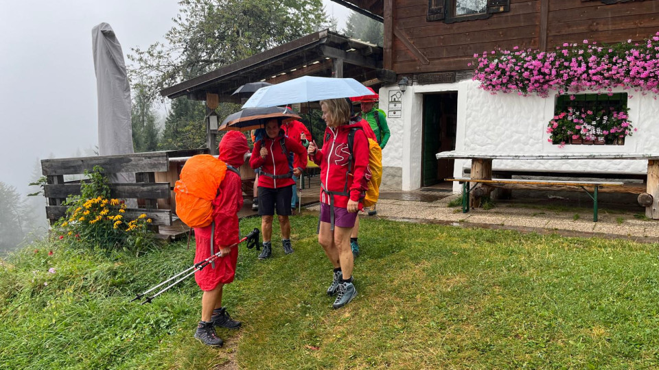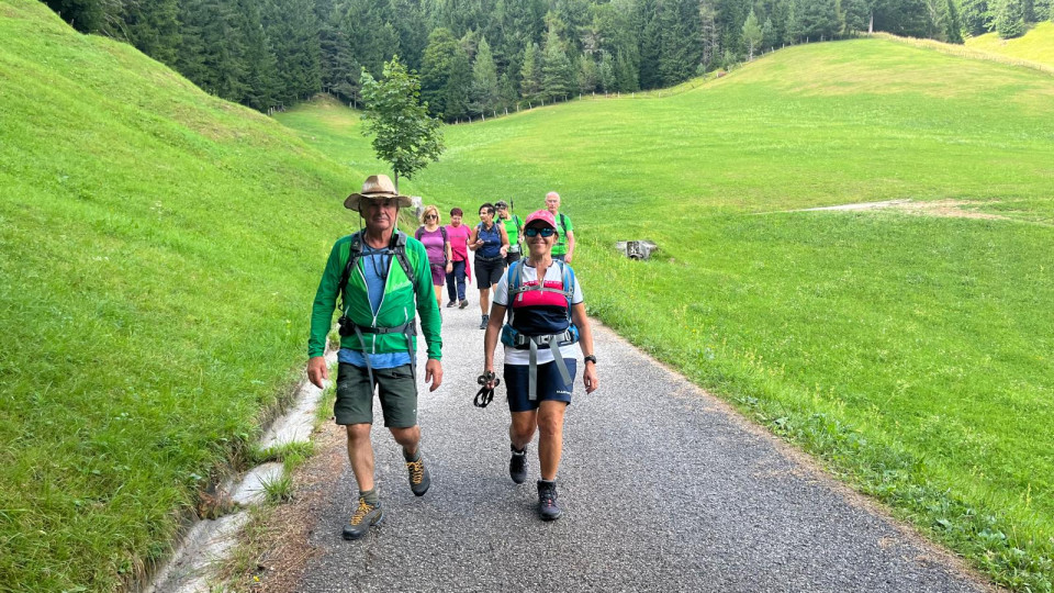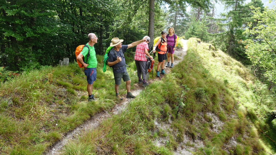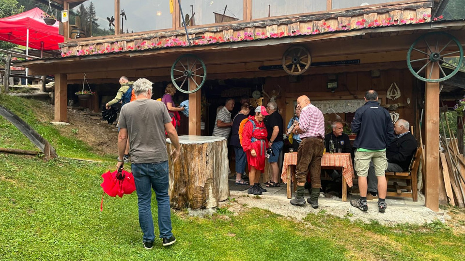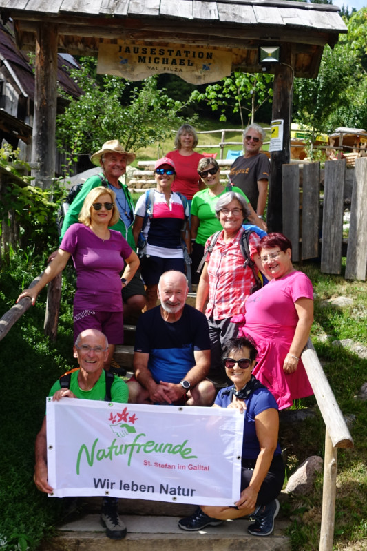Elf Naturfreunde trafen sich in Uggowitz (Ugovizza), wo wir hinter der Kirche vorerst über einen Steig zu unserer Wanderung starteten. Wir marschierten recht steil auf einem Waldweg und erreichten anschließend einen Abschnitt entlang des Panoramaweges mit einem wirklich beeindruckenden Blick auf den Ort. Begleitet wurden wir überdies vom tiefen Glockenklang, welcher aufgrund der Sonntagsmesse ertönte. Auch der letzte Abschnitt führte recht steil durch den Wald, ehe wir bei leichtem Regen die Hütte Malga Priu erreichten, wo in der gemütlichen Stube unser Gewand sofort trocken wurde. Nach der Rast nahmen wir den ebenso steilen Fahrweg im Waldgebiet bis zur Straße und marschierten aufgrund des nahenden Gewitters weiter auf der Straße zur Almhütte Da Michael. Mit den vielen Almbesuchern feierten wir bei Harmonikaklängen, einem hervorragenden Essen und guter Stimmung das Geburtstagsfest.
