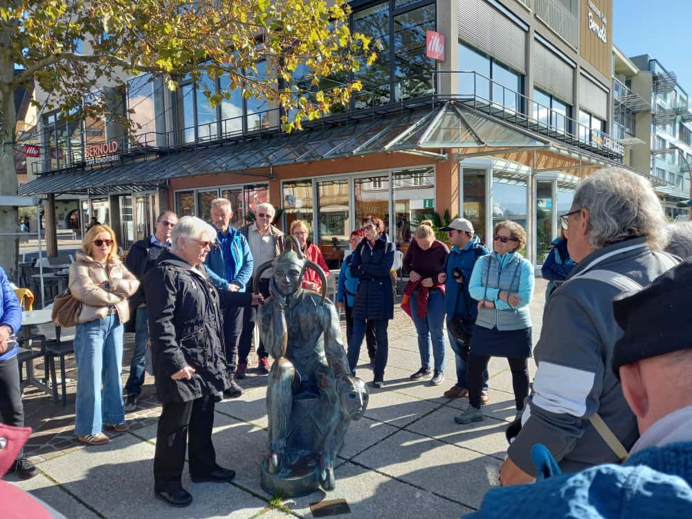 Danach führte uns der Weg zurück zum Relief von Villach aus dem Jahre 1649, wo der Ausgangspunkt der Stadtführung mit der Stadtführerin Christa war. Bedeutend in Villach sind die acht Bronzestatuen, und zwar der hl. Franziskus, der Narr, das Trachtenpärchen, der Braumeister, der Adler, der Feuerwehrmann, der Fahrdienstleiter und seit Juli 2025 der hl. Jakobus. Wir gingen in den Innenhof der einstigen Bamberger Stadtburg, sahen einen Kalkbrennofen und besuchten einen Schauraum mit archäologischen Funden. Grausames berichtete die Stadtführerin beim Pranger und beeindruckend ist die Dreifaltigkeitsstatue mit Florian und Rochus zur Abwehr von Feuer bzw. zum Schutz gegen die Pest. Natürlich besuchten wir auch den Paracelsushof. Denn Paracelsus, ein Vorreiter der Naturmedizin, lebte viele Jahre in Villach. Sehr viel Geschichtliches hörten wir über die Bamberger, die Khevenhüller, Dietrichsteiner u.a. und nicht zu kurz kam auch die Bedeutung von Villach als Eisenbahner- und Hochtechnologiestadt. Mitarbeiter aus mindestens 55 Nationen arbeiten z.B. bei Infineon.