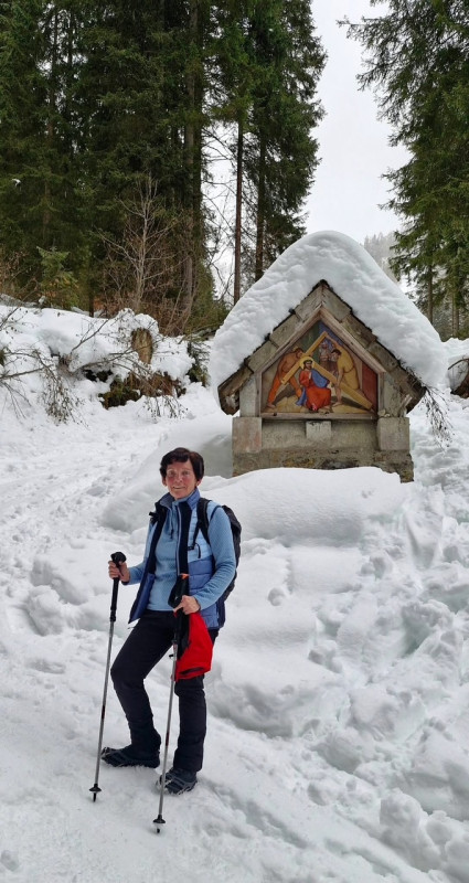 Aufgrund des etwas trüben Wetters mit einigen Schneeflocken blieb die Völkerwanderung aus und so konnten wir den Weg fast alleine genießen. Zum Glück war nur der Parkplatz sehr eisig, auf der Strecke selbst bewegten wir uns wie auf einem Teppich, begleitet von einer zauberhaften Winterkulisse mit schneebedeckten Kreuzwegstationen.