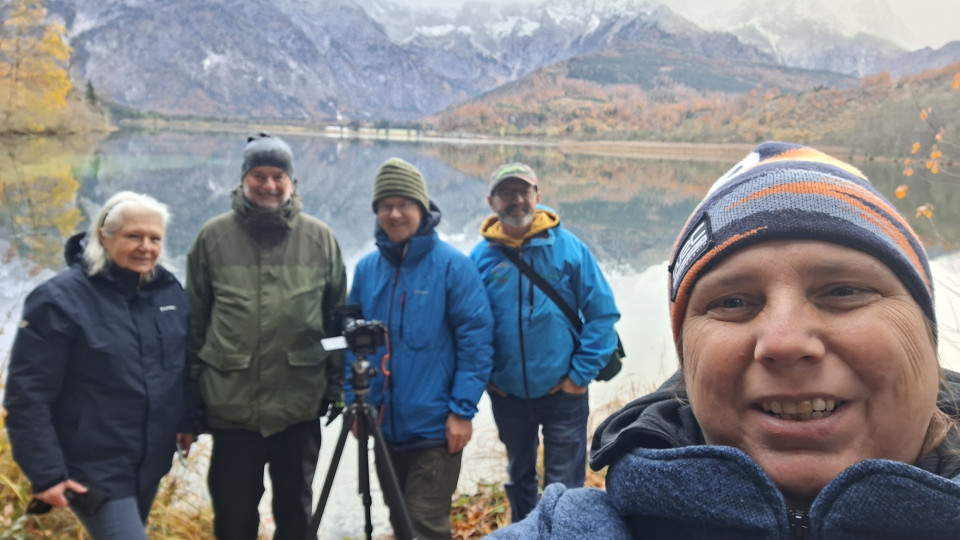 Zu fünft trafen wir uns an der Klause am Almsee. Es war ein grauer Tag, mit Wolken, ein bisschen Regen und Hochnebel – aber wie heißt es so schön: Es gibt kein schlechtes Wetter zum Fotografieren. Wir spazierten gemütlich zu der Bucht, wo das Fernrohr steht, hielten hier und da an und schossen ein paar Fotos. Das Wasser war teilweise ganz glatt und ruhig, und die wunderbaren Farben der Blätter in Rot, Gelb und Braun spiegelten sich im See. Eine herrliche Herbststimmung konnten wir einfangen.