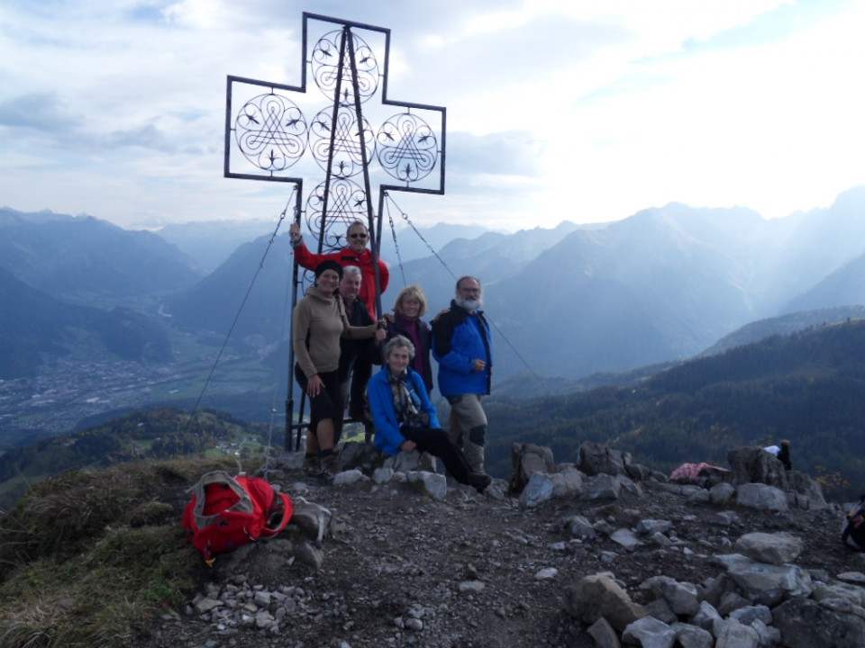 Vom Tschengla-Wanderparkplatz (1170m) aus führte die Route zunächst hinauf zum Nachbarberg Mondspitze(1967m). Unterwegs bei Kaiserwetter zeigten sich vielerlei Herbstblumen in ihren prächtigen Farben. Aufgefallen waren besonders die sattgelben Drollblumen. Ein erstes Highlight dieses Tages war der Anblick eines abgestorbenen Baumstumpfes mit der Form eines Bildstöckleins, das zu einem kurzen Verweilen im Hohlraum des Naturkunstwerkes einlud. Nach dem ersten Fotoshooting an diesem schönen Fleck ging's zügig bergan dem ersten Gipfel entgegen. Dort bot sich ein herrlicher Rundblick auf die Bergwelt des Montafons und des Bregenzerwaldes während des Jausenstopps. Nach kurzer Mahlzeit folgte der Abstieg über den Mondspitzsteig, umrahmt von Latschen, zum Schillersattel, um anschließend das Kelliloch, einen atemberaubenden Krater, zu umrunden. Danach kam der steile Aufstieg zum eigentlichen Tagesziel, dem Schillerkopf (2006m). Anstelle des erwarteten Gipfelkreuzes war nur noch der Sockel vorhanden, da das morsch gewordene Holzkreuz aus Sicherheitsgründen abgebaut war. Diese Überraschung beeinträchtigte aber weder den Appetit auf die Rucksackverpflegung noch den Hochgenuss der Fernsicht. Nach dem Abstieg wurde die Tour mit einer kurzen Einkehr abgeschlossen. Dort war zufällig auch ein gut bekanntes Naturfreundepärchen aus dem Oberland anwesend, welches mit Mountainbikes unterwegs war.