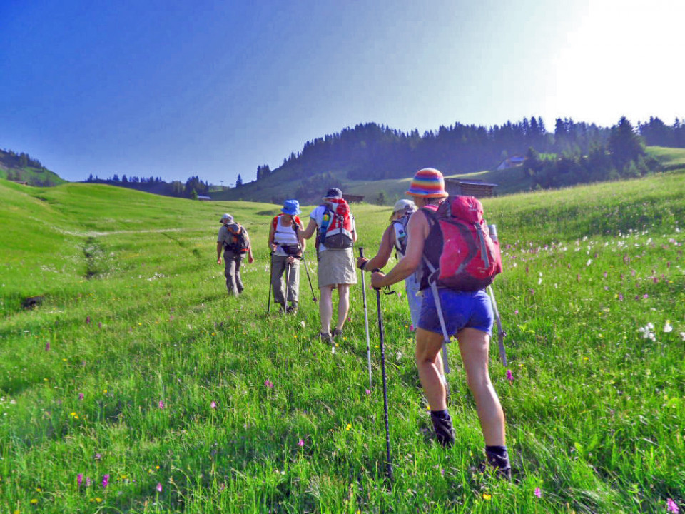 Als erstes ging's, bei angenehmer Morgentemperatur, sehr steil ca. 600 Höhenmeter hinauf zum ersten Gipfel - Hohes Licht, 2009 m. Ein feiner Rückenwind erleichterte den Anstieg ungemein. Während der ersten Trinkpause hatte ein Teilnehmer nochmal einen kurzen Ab- und Aufstieg zu bewältigen, weil er unterwegs, beim Fotografieren, sein Hemd vergessen hatte. Danach ging es planmäßig weiter zum Hochblanken, 2068 m, dann zum Ragazer Blanken, 2051 m, weiter zur Sünser Spitze, 2062 m. Von dort hinab zum Sünsersee, wo die Gruppe einen erfrischenden Badeaufenthalt mit Jause einlegte. Es folgte ein letzter Anstieg zum Sünser Joch, um von dort ins Tal zu gelangen. Auf der ganzen Strecke bot sich den Wanderlustigen eine farbenreiche, vielseitige Blumenpracht, die die Herzen höher schlagen ließ, und es erfolgte ein reger Austausch über die Namen der Blumen und Wirkungen vieler Kräuter.