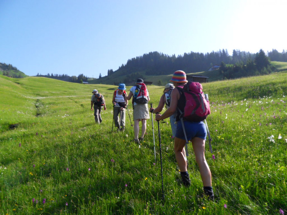 Optimale Verhältnisse boten sich der Kennelbacher Naturfreundegruppe bei ihrer Wanderung von Damüls zur Sünserspitze, 2062 m. Als erstes ging's, bei angenehmer Morgentemperatur, sehr steil ca. 600 Höhenmeter hinauf zum ersten Gipfel - Hohes Licht, 2009 m. Ein feiner Rückenwind erleichterte den Anstieg ungemein. Während der ersten Trinkpause hatte ein Teilnehmer nochmal einen kurzen Ab- und Aufstieg zu bewältigen, weil er unterwegs, beim Fotografieren, sein Hemd vergessen hatte. Danach ging es planmäßig weiter zum Hochblanken, 2068 m, dann zum Ragazer Blanken, 2051 m, weiter zur Sünser Spitze, 2062 m. Von dort hinab zum Sünsersee, wo die Gruppe einen erfrischenden Badeaufenthalt mit Jause einlegte. Es folgte ein letzter Anstieg zum Sünser Joch, um von dort ins Tal zu gelangen. Auf der ganzen Strecke bot sich den Wanderlustigen eine farbenreiche, vielseitige Blumenpracht, die die Herzen höher schlagen ließ, und es erfolgte ein reger Austausch über die Namen der Blumen und Wirkungen vieler Kräuter. Nach sieben, teils auch mit Mühen verbundenen, aber wunderschönen Stunden, ging es wieder heimwärts mit einem kurzen Einkehrschwung in Wolfurt. Vom sagenumwobenen Stier im Sünser See waren leider keine Spuren zu finden. (Quelle: Die Sagen Vorarlbergs von Franz Josef Vonbun, Seite 88.) Haben wir auch dein Interesse geweckt? Kontakt: Dietmar Kugler, St. Antoniusweg 5, 6921 Kennelbach, 0664 4648654, kennelbach@naturfreunde.at,