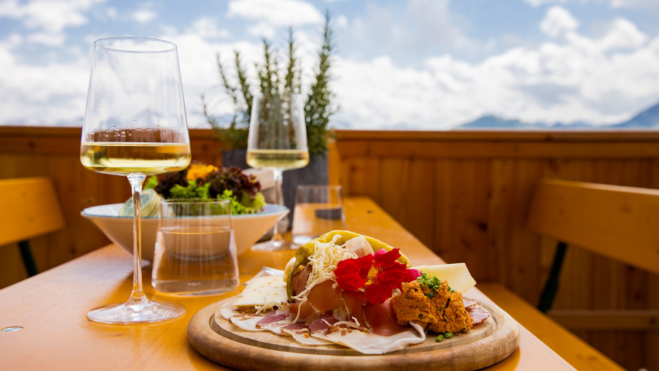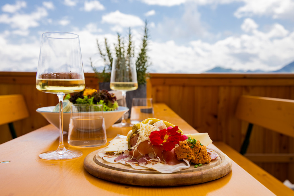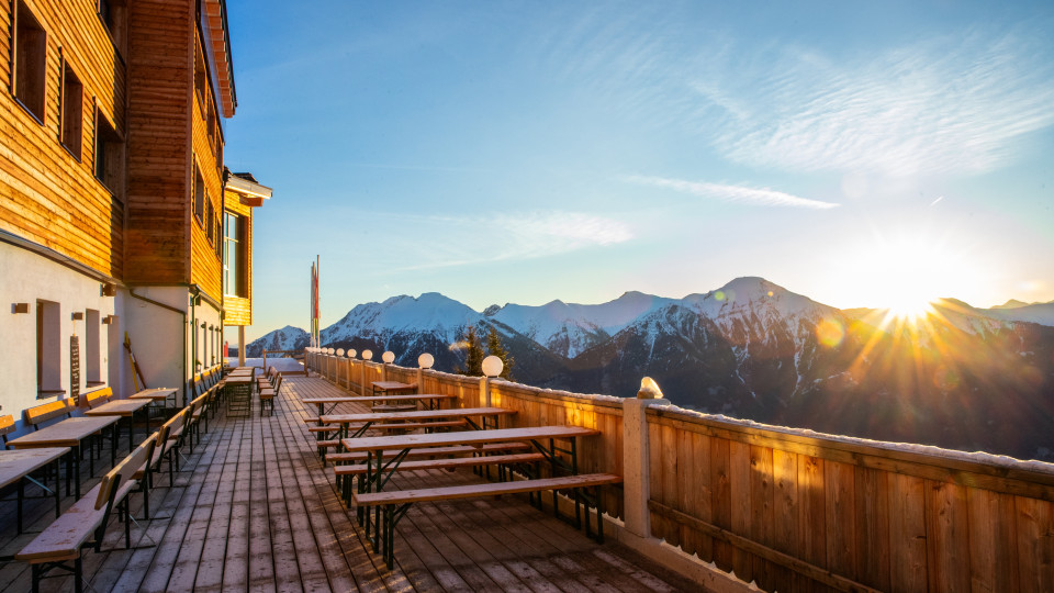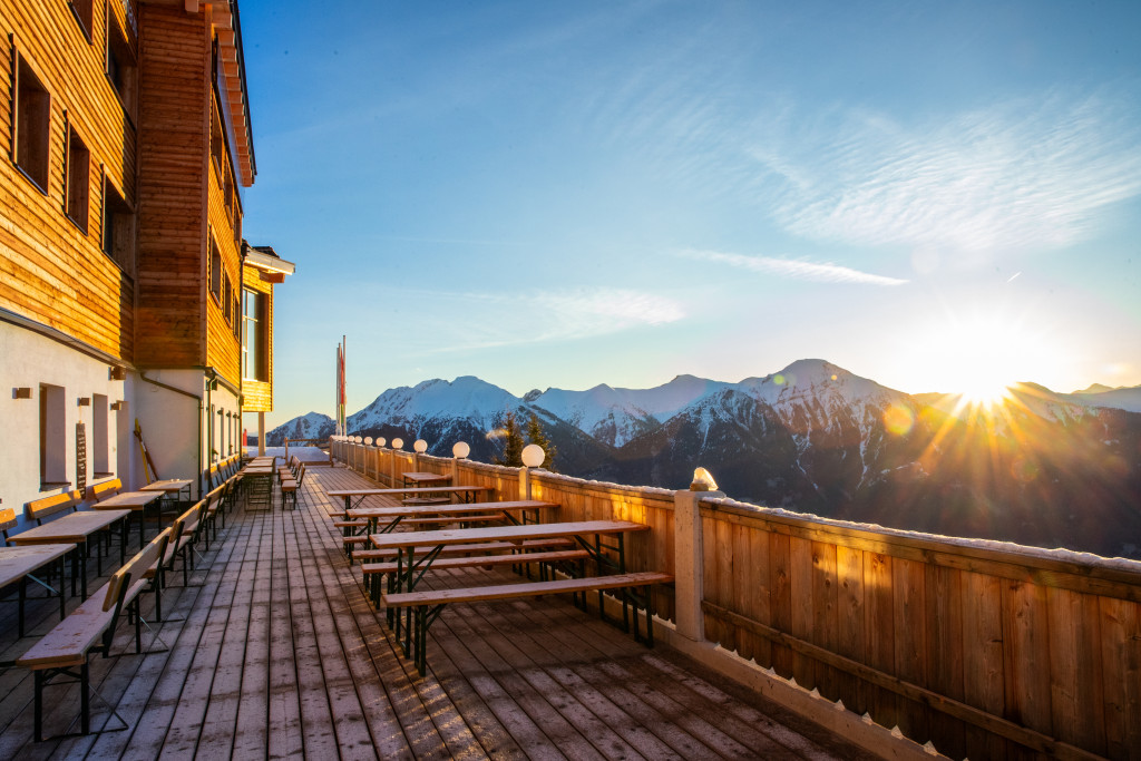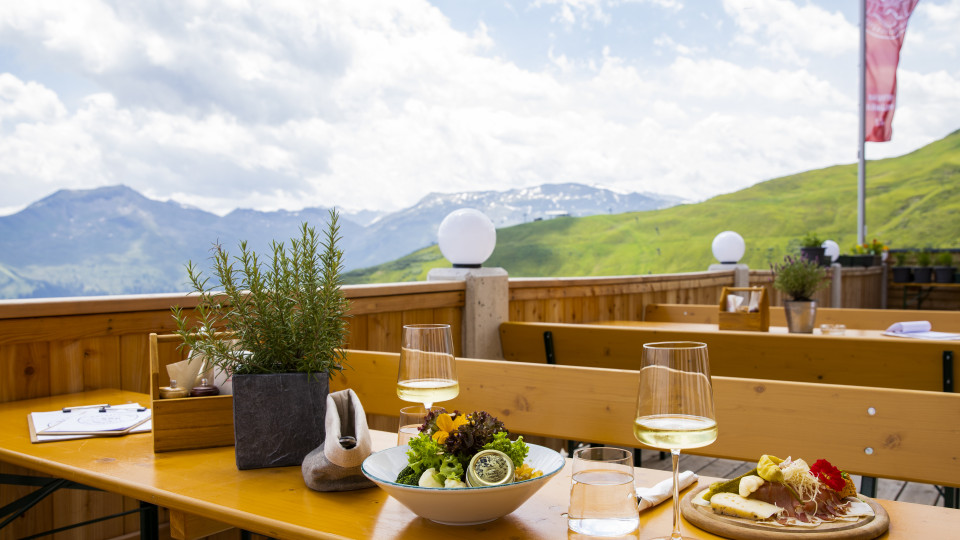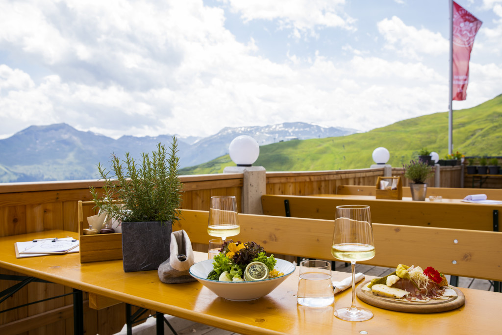 Auf der großzügigen Sonnenterrasse finden rund 100 Gäste Platz, um den wunderschönen Panoramablick über das Gasteinertal zu genießen.