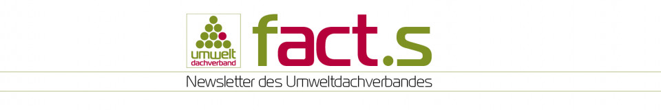 fact.s - der elektronische Newsletter des Umweltdachverbandes - bringt monatlich Top-Informationen aus den Bereichen Umwelt, Natur und Nachhaltigkeit, Veranstaltungs-, Tagungs-, Workshop- und Weiterbildungshinweise, Buch- und Broschüren-News sowie aktuelle Jobausschreibungen direkt in Ihre Mailbox.